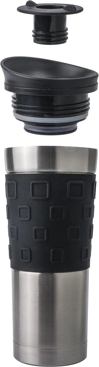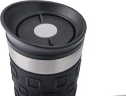 Stylischer Thermobecher aus doppelwandigem Edelstahl. Hält Getränke ca. 4 Stunden warm und 8 Stunden kalt. Dank der 360° Öffnung können Sie den Becher problemlos mit einer Hand bedienen und wie aus einer Tasse vom Becherrand trinken. Das gummierte Band ermöglicht eine rutschfeste Griffzone. Der Druckknopfverschluss ist in zwei Teile zerlegbar und kann somit problemlos gereinigt werden. Zudem ist der Thermobecher spülmaschinenfest und 100 % dicht. Geeignet für unterwegs, im Auto, beim Wandern, zu Hause oder in der Arbeit.