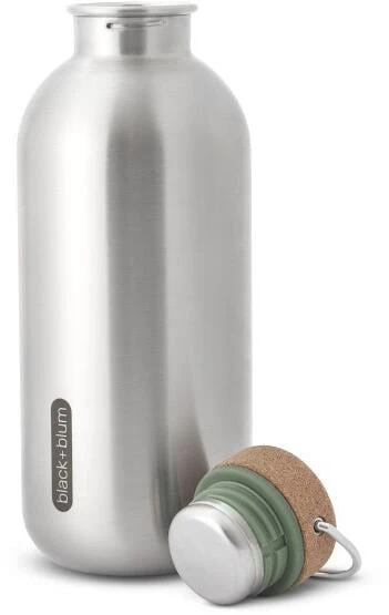 black+blum – Trinkflasche aus Edelstahl. Die besonders leichte Edelstahl-Trinkflasche im neuen Design fasst 600 ml und besitzt einen stilvollen Korkdeckel mit praktischem Tragebügel. Dank der weiten Öffnung können der Flasche auch Eiswürfel oder Aktivkohle hinzugefügt werden. Aufgrund des durchdachten Designs kommen die Getränke nicht mit Kunststoff in Berührung. Lediglich für den auslaufsicheren Verschluss wurde ein Gewinde aus Kunststoff verwendet.