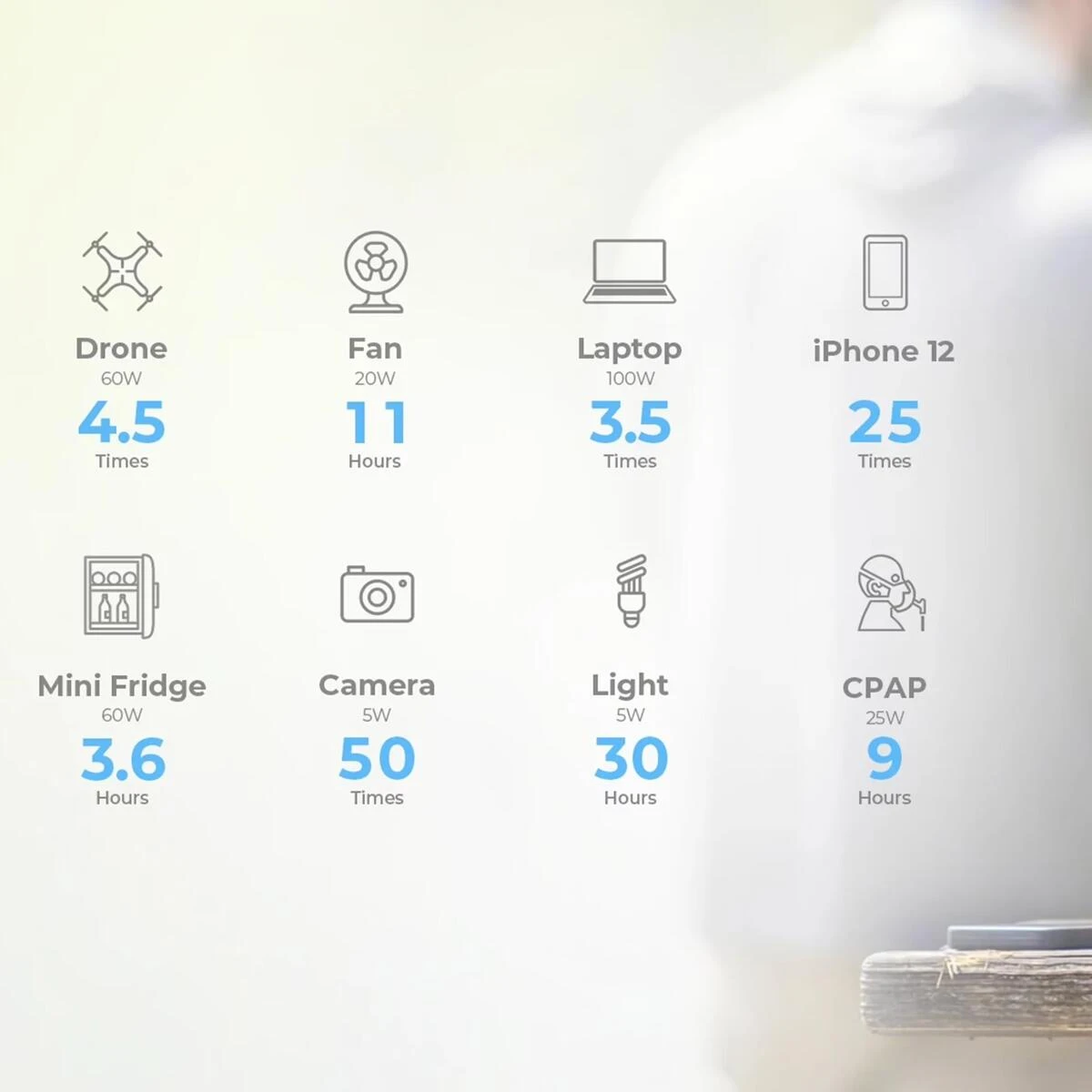Die EB3A ist sehr kompakt, aber Sie können sich bei großen Anforderungen auf sie verlassen. Ob kleiner Mixer, Mini-Reiskocher oder kleiner Kühlschrank: Die EB3A versorgt Sie dank des 600-W-Wechselrichters (1200-W-Spitzenpannung) mit reinem Sinus und einer beeindruckenden Kapazität von 268 Wh mit allem.