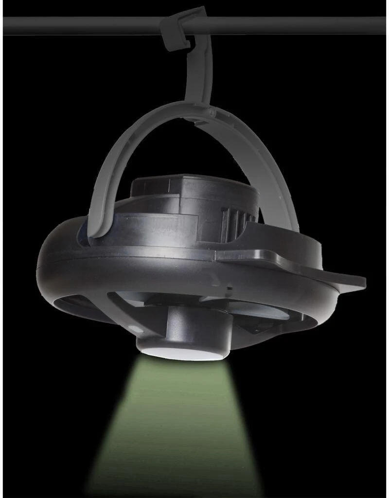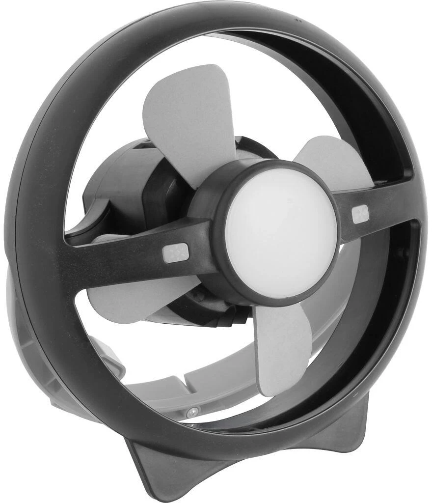 Diese praktische wiederaufladbare Licht-Ventilatorkombination liefert gleichzeitig helles LED-Licht und die kühle Brise eines leistungsstarken Vierblatt-Ventilators in 2 Leistungsstufen. Seine Akkus werden über einen kabelgebundenen 12 Volt-USB-Adapter aufgeladen. Der Ventilator kann mittels Klappgriff oder Haken an Zeltdecken oder Wänden aufgehängt oder auch auf ebene Flächen gestellt werden; Maße Ø 22 x H 13 cm.