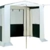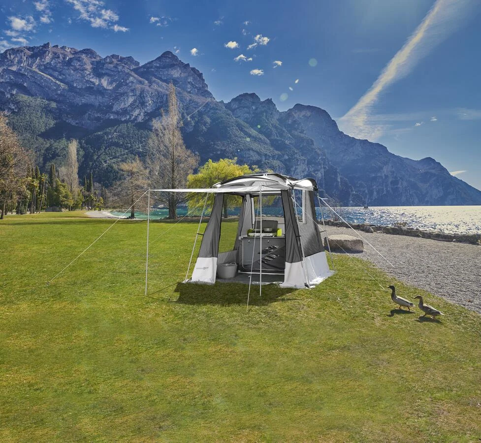Vielfach einsetzbares Küchen- und Materialzelt mit stabilem Stahl-/Fiberglasgerüst, grossen Fenstern und einer hochrollbaren Eingangstür. Mit Rundum Erdstreifen. Inkl. Montagematerial und Packsack.