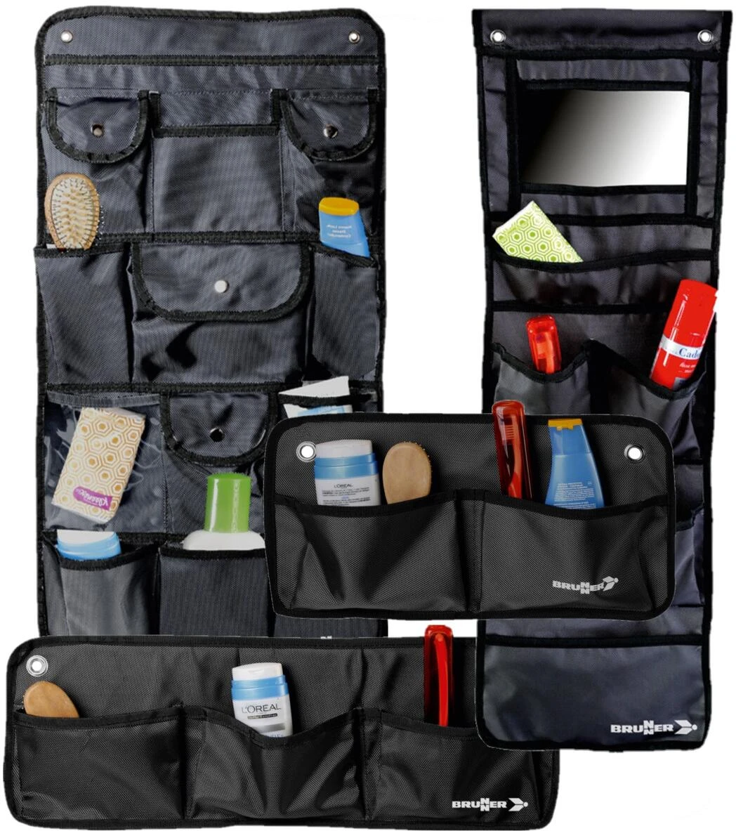 Praktischer Hängeorganizer aus robustem Polyestergewebe zur Befestigung an Wänden und Türen mittels Ösen und Haken.