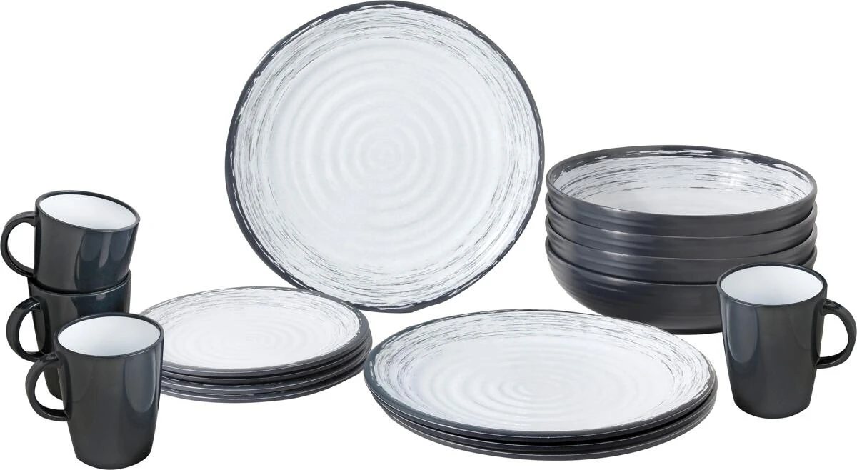 Das Geschirrset Granada hat eine schlichte Optik und Haptik in dezenten Farben. Das Set hat einen Anti-Slip Untergrund und die Henkelbecher sind aus Resylin.