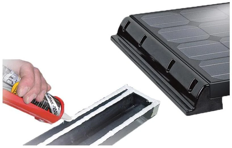 Spoilerprofile passen sich optimal der Aerodynamik von Fahrzeugdächern an. Ohne zu bohren können mit dem Klebe-Set diese leichten und witterungsbeständigen PUR-Halterungen auf serienmäßig lackierten Flächen bzw. GFK-Untergründen aufgeklebt werden. An den Befestigungsfenstern der Profile, die wir für viele Standardmodule in den Seitenlängen 33 cm, 45 cm, 53 cm, 60 cm sowie 66 cm anbieten, werden die Solarmodule einfach mit Edelstahlschrauben (im Klebe-Set enthalten) am Alu-Rahmen angeschraubt. Eine optimale Unterlüftung ist gewährleistet. Die Spoiler werden montagefertig in schwarz geliefert. Sie können aber auch nachträglich lackiert werden. Ein Set besteht immer aus zwei Spoilerprofilen.