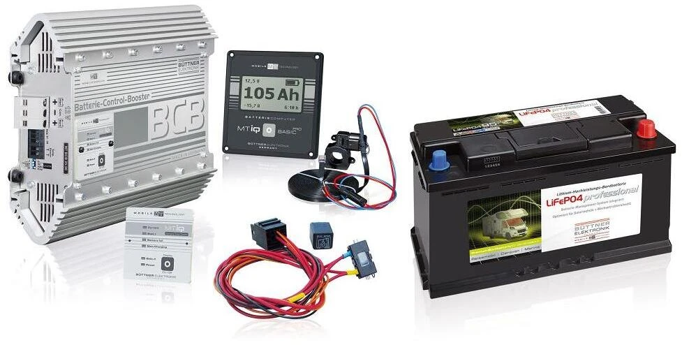 Das Lithium-Batterie Power Set ist die optimale Kombination für Reisemobil oder Kastenwagen. Mit dem Set jetzt auf Lithium-Batterien umstellen oder das Neufahrzeug von Anfang an damit ausstatten. Die Kombination der einzelnen Komponenten versichern immer volle Kapazität und einen sicheren Betrieb in allen Klimazonen und zu jeder Jahreszeit. Das Set ist so konzipiert, dass es als eigenständiges System funktioniert, aber auch parallel an eine bereits vorhandene Bordelektronik angeschlossen werden kann. Das Set besteht aus einer Lithium-Bordbatterie MT Li 85, MT Li 105 oder MT Li 120 in Kombination mit einer Ladegerät/ Booster-Kombi und einem Batterie-Computer (MT iQ Basic). Alle Geräte sind von Büttner Elektronik entwickelt und optimal aufeinander abgestimmt. Das Lade/Booster-Kombigerät (BCB 25/20) versorgt die Batterie bei vorhandenem 230 V-Netz mit Ladestrom (20 A) und schaltetwährend der Fahrt automatisch auf Boosterladung (25 A) um. In beiden Ladesituationen erhält das Gerät direkte Informationen von der Lithium- Batterie, um diese optimal aufzuladen.