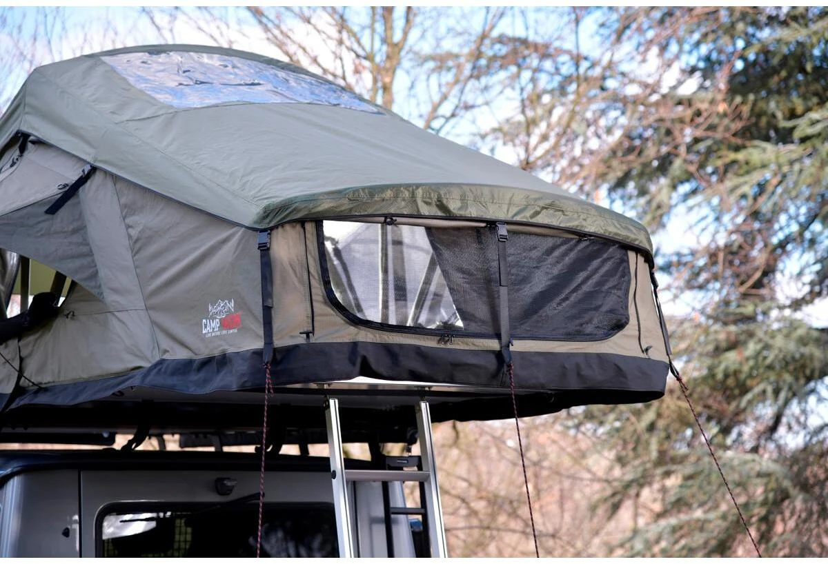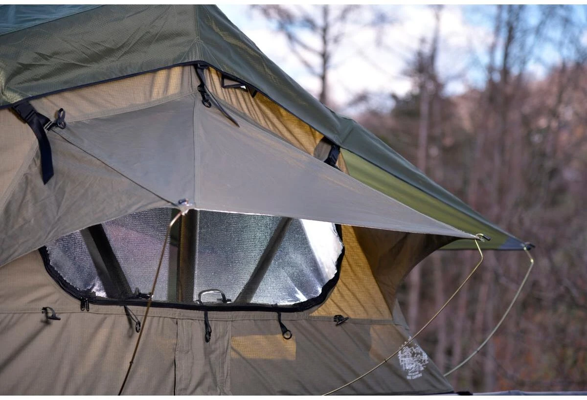 Entfernt man die Abdeckplane indem man die Klettverschlüsse und den Reißverschluss öffnet, lässt sich das Dachzelt mit wenigen Handgriffen mittels der integrierten Teleskopleiter entfalten. Über diese Leiter aus robustem Aluminium gelangt man in den großzügigen Schlafraum. Dort kann man es sich gleich auf der hochwertigen und bequemen Kaltschaummatratze bequem machen. Als Matratzenunterlage wurde ein zusätzliches PVC-Membran eingebaut um sie vor Feuchtigkeit zu schützen. Ein ganz besonderes Highlight bieten die zwei Panorama Dachfenster, durch denen man abends besonders schön in den Sternenhimmel schauen kann. Außerdem verfügt das Adventure Dachzelt über rundherum große Fenster, alle versehen mit einem sehr feinen Moskitonetz, einem von innen verschließbaren Wetterschutz sowie speziellen Überdachungen, die das Durchlüften auch bei starkem Regen ermöglichen. Das mitgelieferte Tropendach welches man ganz einfach abnehmen kann, z.B. um es zu Reinigen, sorgt für das perfekte Klima im Zelt, auch in besonders warmen Regionen. Die Luftschicht zwischen Wohnkabine und Tropendach verringert die Hitzeentwicklung im Zelt.