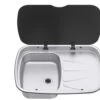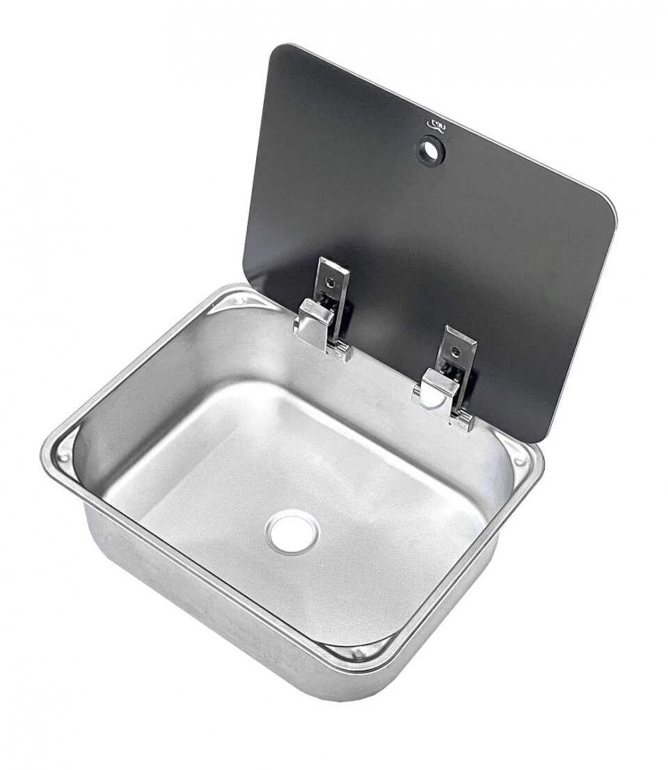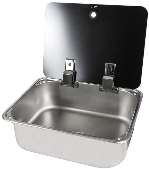 Rechteckige Spüle aus Edelstahl mit Deckel aus gehärtetem Glas.