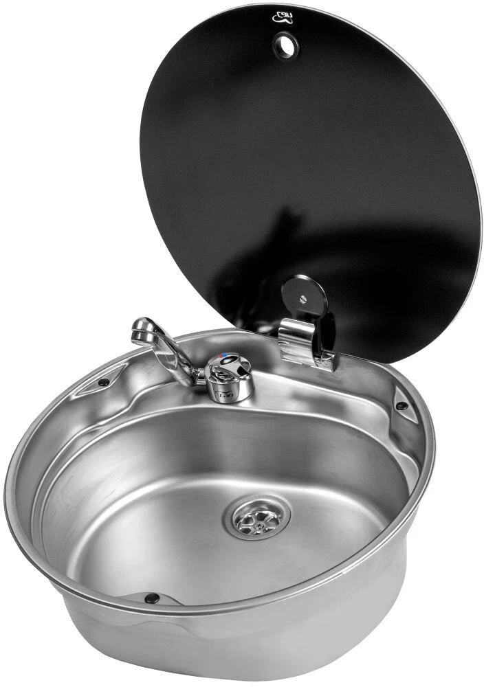 Runde Einbauspüle aus Edelstahl und Deckel aus gehärtetem Glas. Wasserhahn nicht enthalten. Bohrung für Wasserhahn: ø 33 mm