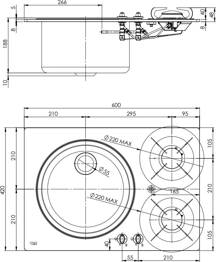 - Brennerleistung: 2 mittlere Brenner à 1750 Watt – 127 g/h