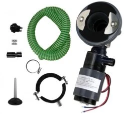 Die Montage erfolgt direkt unter dem Toilettenflansch an Stelle der Fäkalienkassette. Die Pumpe ist einfach zu montieren. Angesteuert wird diese über einen mitgelieferten separaten Tastschalter. Die Stromversorgung liefert die Bordbatterie oder ein Umformer mit konstanter Leistungsabgabe von 12V/180W. Die Montage kann jederzeit rückgängig gemacht werden.