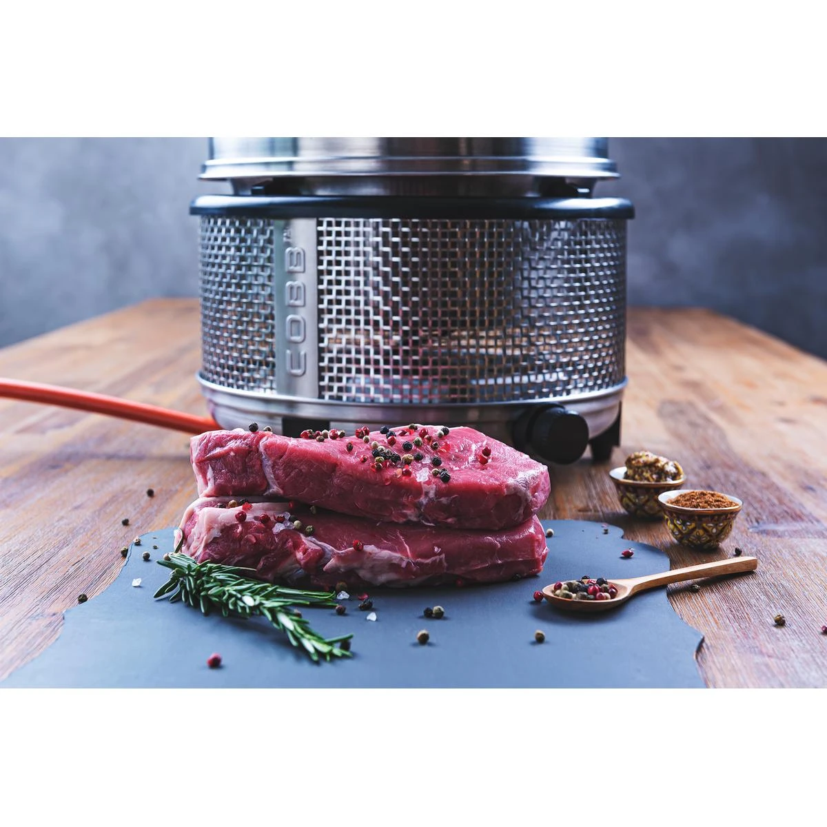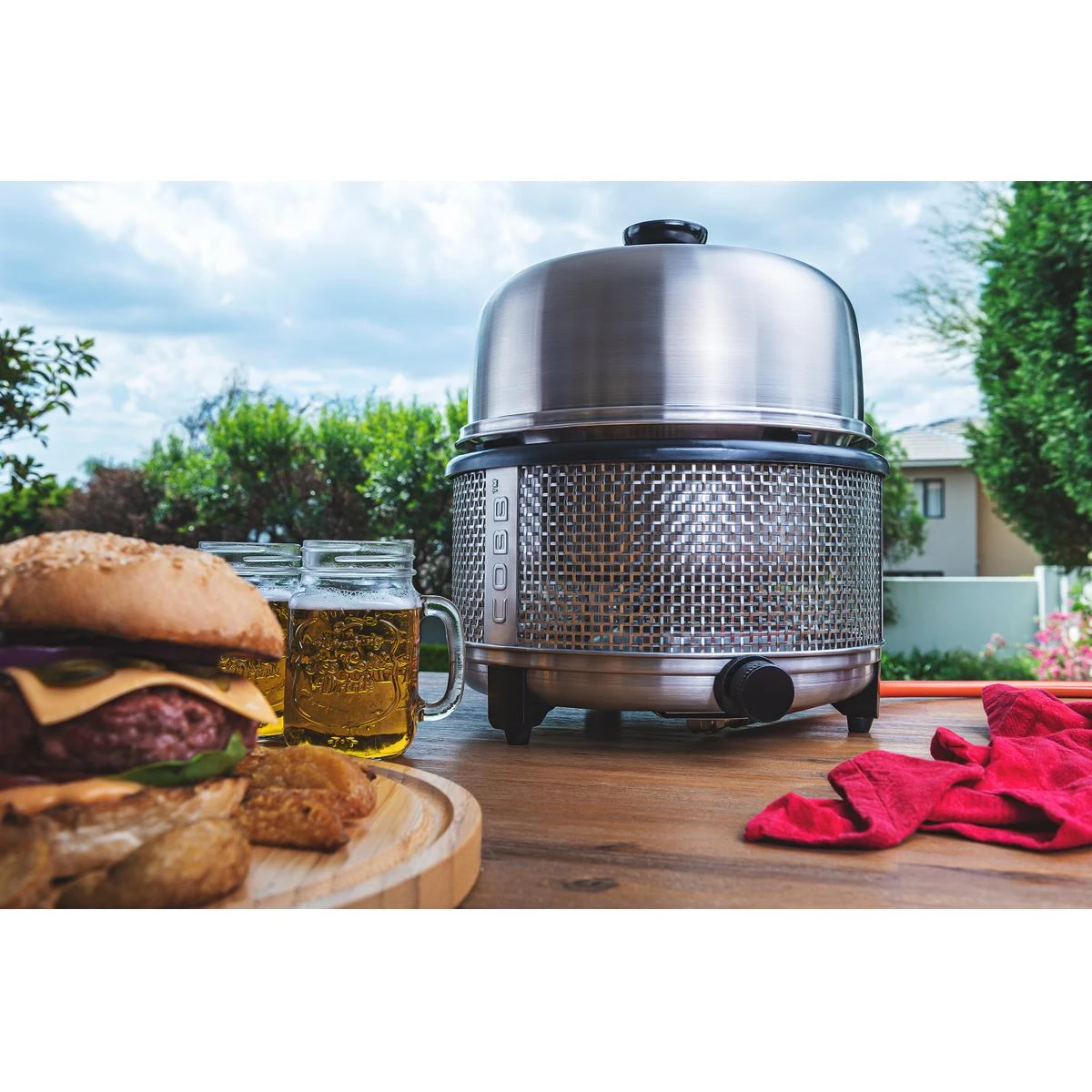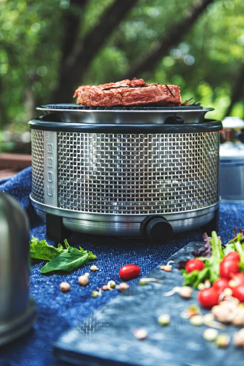 Der Cobb Grill ist wahrscheinlich die kleinste und schnellste Outdoor Küche der Welt. Grillen Sie ganz ohne Stichflammen und lästigen Qualm – setzen Sie den Cobb Grill überall ein. Auf dem Cobb können Sie grillen, braten, backen, und räuchern – ja praktisch alles. Der Grill ist aus Edelstahl hergestellt. Fett und Flüssigkeiten werden abgeleitet. Die Wärme wird isoliert, so dass die Aussenhülle des Grills kalt bleibt. Die Einzelteile aus Edelstahl sind rostfrei und spülmaschinenengeeignet. Die Grillplatte ist aus extra dickwandigem Aluminium und sichert perfekte Wärmeverteilung und ein noch besseres Grillergebnis. Mit den tiefen Rillen als Fettauffang wird die Flammen- und Rauchentwicklung minimiert. Besonders gut für Steaks geeignet.