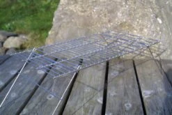 Zusammenlegbare Grills aus Stahl mit verchromter Oberfläche. Auseinanderklappen und über das Feuer oder die Glut stellen, zum Grillen, Kochen oder Brutzeln auf die romantische Art.