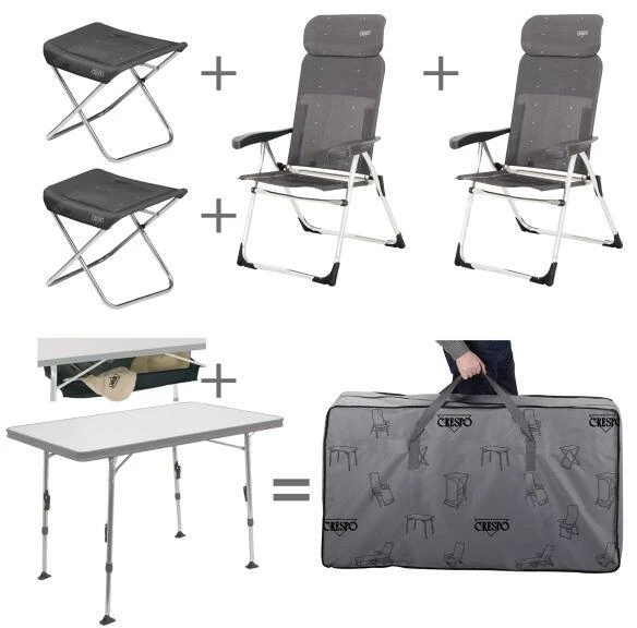 Das Crespo Stuhl- und Tischset Valencia besteht aus dem bereits bekannten Campingtisch mit verstärkter Tischplatte und zwei kompakten Klappstühlen. Bei diesem Set kann zwischen ungepolstert und gepolsters, sowie jeweils einer zusätzlichen Fußablage gewählt werden. Zudem ist ein praktisches Ablagenetz für den Tisch und eine passende Tragetasche für das gesamte Set dabei. Durch das kleine Packmaß und geringe Gewicht ist das Set besonders für Kastenwagen und Vans geeignet.