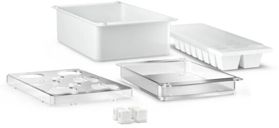 Stapelboxen, passende Eieretagere und Eiswürfelbereiter mit praktischem Schiebedeckel.