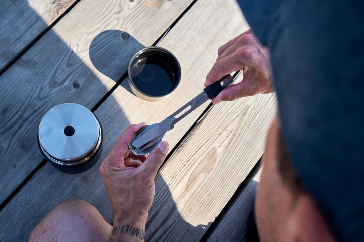 Dieses robuste und mit 42g dennoch ultra-leichte Besteck-Set erfüllt diese Anforderungen. Hergestellt aus Titan lässt es sich praktischerweise übereinander stapeln und wird für den Transport mit einer hitzebeständigen Silikon-Manschette zusammengehalten.