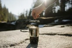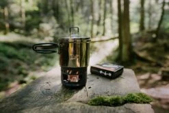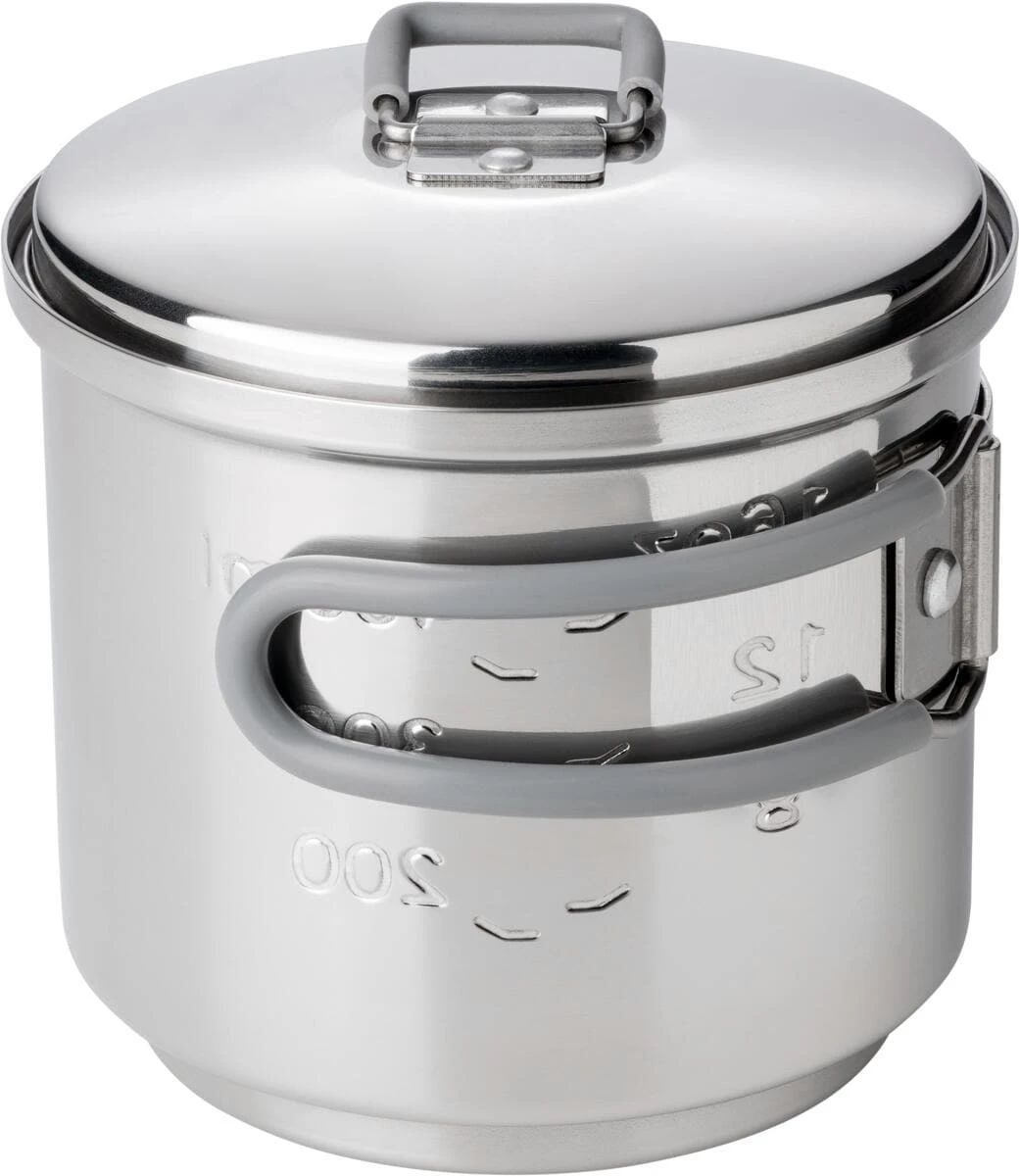 Der Topf, bestehend aus hochwertigem Edelstahl, fasst ca. 585 ml und ist ausgestattet mit einer Volumenanzeige in Oz und Liter. Der Stand aus extrem leichtem Aluminium lässt sich platzsparend im Topf transportieren. Besonders praktisch: Die Deckelaufhängung sowie die platzsparenden Klappgriffe aus Edelstahl. Geliefert im praktischen Netzbeutel und zu befeuern mit 14g Esbit Trockenbrennstoff-Tabletten.