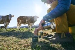 Das Gewicht beträgt trotzdem nur ca. 287 g, die Abmessungen fallen mit einem Packmaß von ca. H 103 mm x Ø 110 mm weiterhin sehr transportfreundlich aus. Natürlich haben wir auch bei diesem Set an die praktischen Details gedacht: So lässt sich der Stand beim Transport platzsparend im Topf verstauen; der Deckel kann beim Kochen dank praktischem Haken am Deckelboden bequem am Topfrand aufhängt werden.