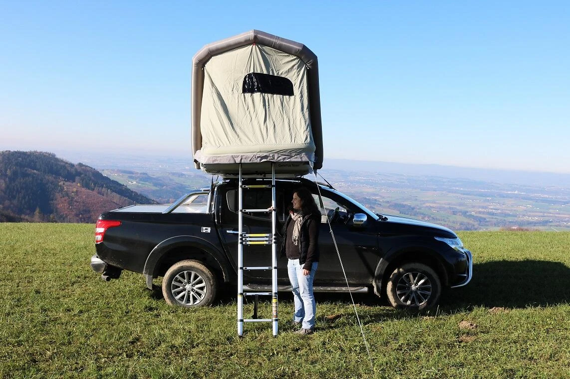 Das GT Dachzelt ist das weltweit erste aufblasbare Dachzelt mit einem Gewicht von nur 25 kg und einem Packmaß von 100 x 100 x 15 cm. Es ist einfach in der Handhabung und um rund zwei Drittel leichter als gleichwertige Konkurrenzprodukte. Damit ist es auch für Fahrzeuge mit geringen Dachlasten geeignet.
