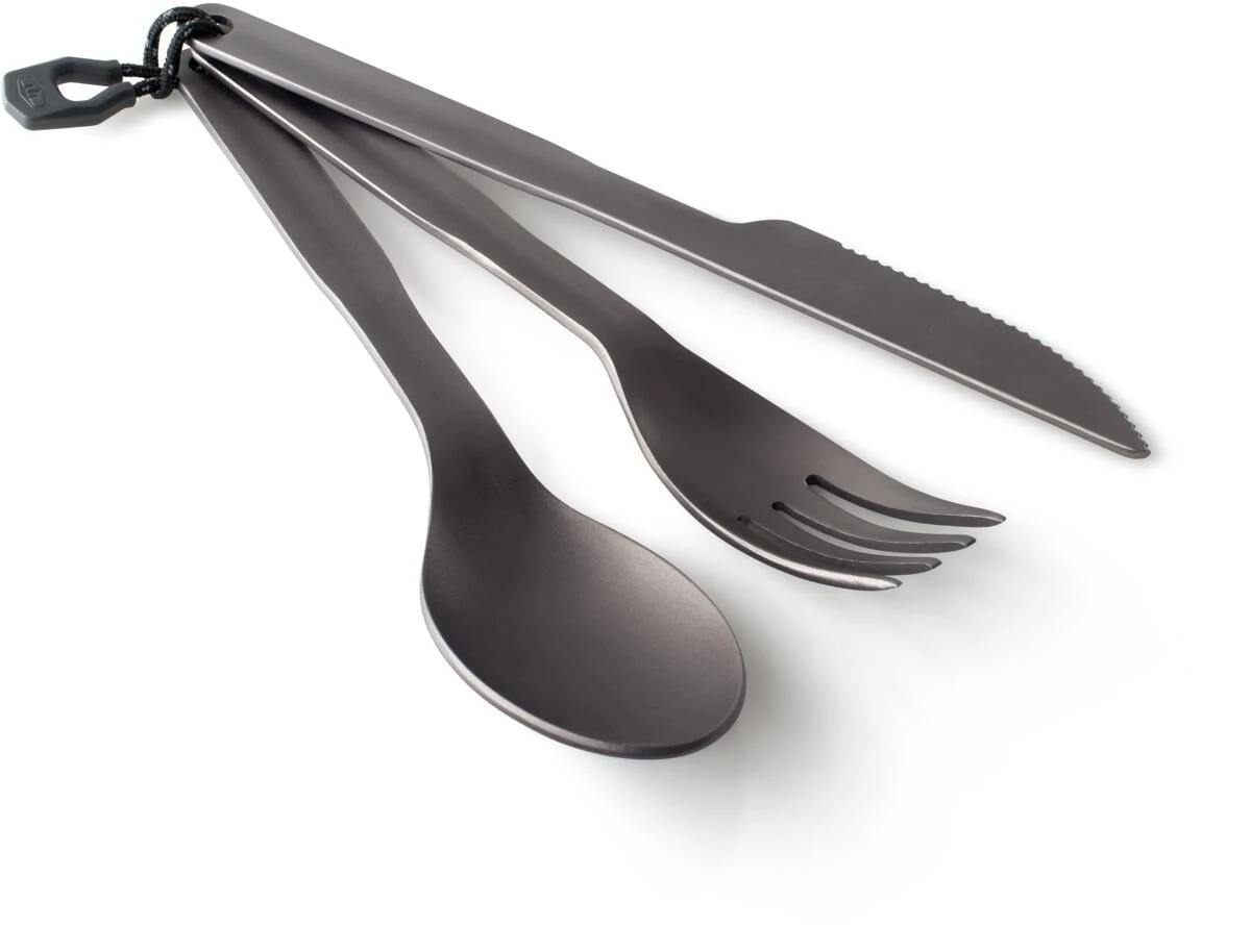 Dieses Ringbesteck besteht aus einer proprietären, ultraleichten Aluminiumlegierung, die sowohl stark als auch leicht ist. Wir haben ein Band beigelegt, das alles zusammenhält und dabei hilft, das Verschwinden dieser berüchtigten Backcountry-Acts zu verhindern.