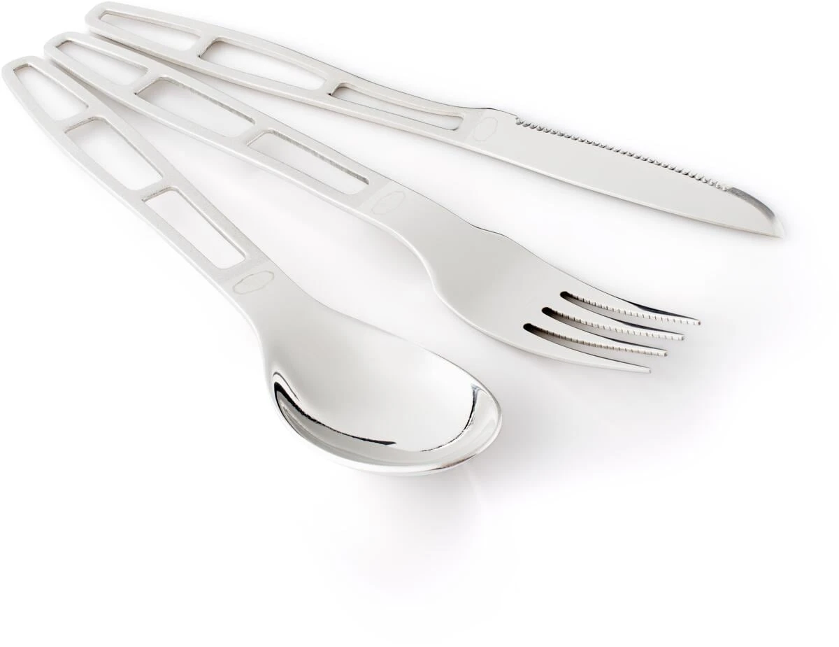 Das einfache, aber robuste Glacier Stainless 3er Besteckset bietet ein bombensicheres Set von camptauglichen Utensilien, die Generationen überdauern.