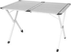 Leichtgewicht Alu Camping-Tisch mit rollbarer Tischplatte aus Alu Paneelen und 4 höhenverstellbaren Tischbeine. Leichte Montage und kleines Packmaß.