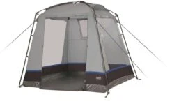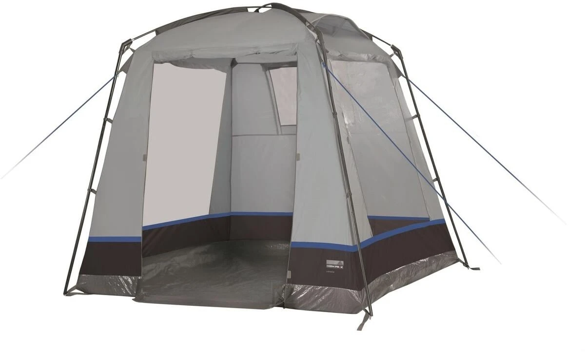 Gerätezelt mit fest eingenähtem Boden der Schmutz und Feuchtigkeit fern hält. Die Bodenwanne kann im Eingangsbereich mittels Reißverschluss für einen ebenerdigen Eingang herunter geklappt werden. 2 Klarsichtfolienfenster mit Abdeckklappen bringen Licht ins Zelt. 2 Hochentlüftungen und ein Lüftungsfenster vermeiden Kondensation.