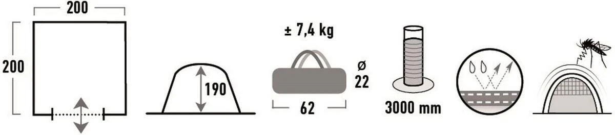 - Material: Aussenzelt: 100% Polyester 150D Hypertex, nahtversiegelt – Wassersäule:3000 mm
