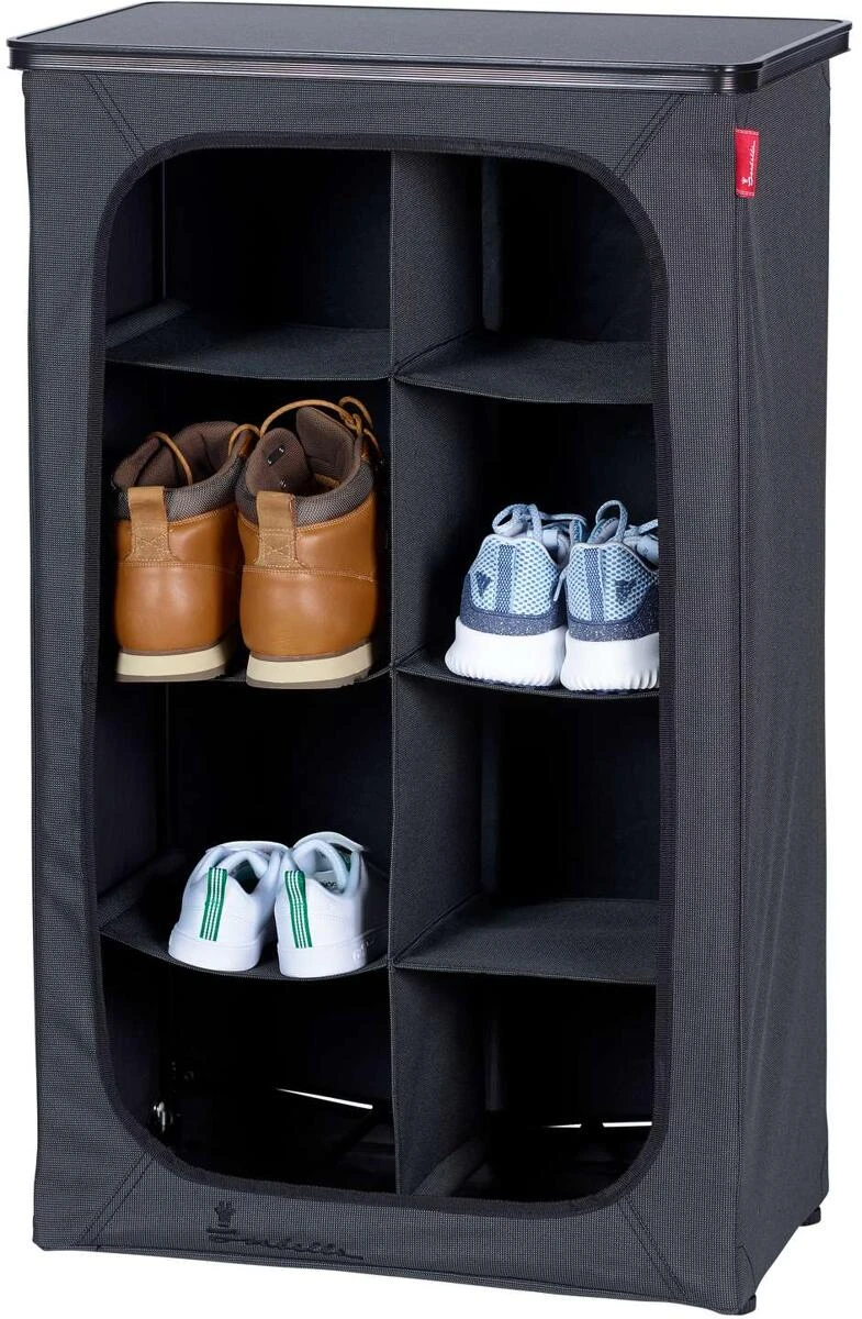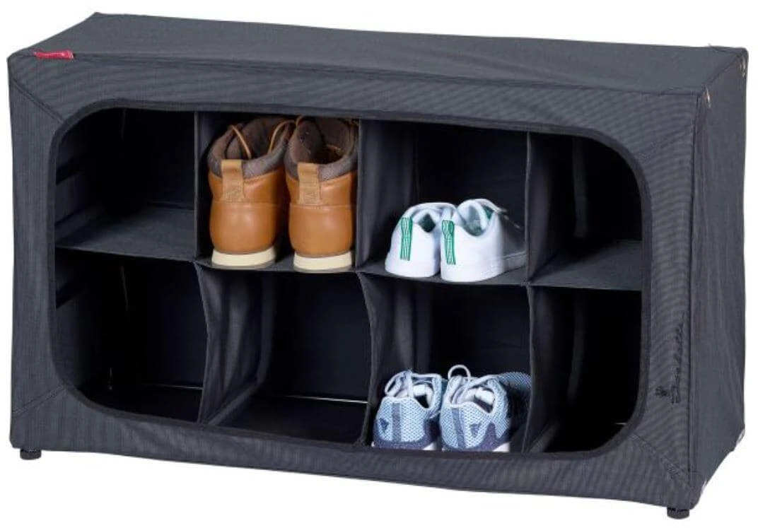 Mit diesem Schuh-Organizer bringen Sie zum Beispiel im Campingurlaub System in die Schuhablage der Familie. Sie können die Schuhe in verschiedene Fächer stellen, damit sie leicht zu finden sind, wenn Sie schnell etwas an die Füße ziehen müssen. Der Schuh-Organizer lässt sich problemlos aufklappen und bei Saisonende wieder zusammenfalten. Er ist aus Aluminium und Textil gefertigt und damit reinigungsfreundlich.