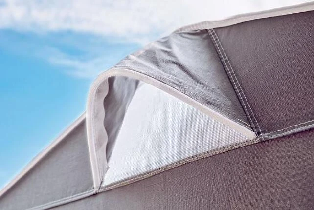 - Front- und Seitenwandmaterial: PVC 380 g/m2 – beschichtetes Gewebe, sehr leicht zu reinigen, sehr belastbar