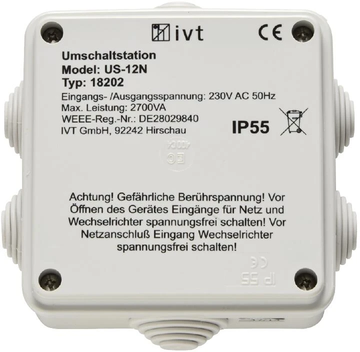 Die Umschaltstation US-12N ermöglicht es Ihnen störungsfrei 230 V AC Verbraucher über zwei unterschiedliche Spannungsquellen zu versorgen, beispielsweise über einen Wechselrichter und das öffentliche 230 V Stromnetz. Die maximale Anschlussleistung beträgt 2700 VA. Mit der Prioritätenschaltung legen Sie fest, welche Spannungsquelle bevorzugt verwendet werden soll – fällt diese Spannungsquelle aus, schaltet die Umschaltstation automatisch auf die Ersatzspannungsquelle um. So laufen Ihre Geräte trotz Stromausfall oder erschöpftem Akku weiter. Die hochwertigen Relais sorgen für eine präzise Umschaltschwelle. Dadurch ist Ihr Wechselrichter besonders gut vor Rückeinspeisung von Fremdspannung geschützt.