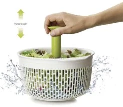 Dieses innovative Design vereint die Eigenschaften einer Salatschleuder mit denen eines Abtropfsiebs und spart damit wertvollen Stauraum. Befestigen Sie zur Salatzubereitung einfach die Spindel und den Saugnapf am Abtropfsieb, geben Sie den Salat hinein und spülen Sie ihn gründlich unter dem Wasserhahn durch. Befestigen Sie das Abtropfsieb dann mit dem Saugnapf in der Spüle und pumpen Sie die Spindel auf und ab, um das Sieb rotieren und überschüssiges Wasser ablaufen zu lassen. Zur Verwendung als herkömmliches Abtropfsieb nehmen Sie die Spindel und den Saugnapf einfach ab und nutzen die seitlichen Griffe. Nach getaner Arbeit lassen sich Spindel und Saugnapf zur Aufbewahrung platzsparend zusammenstecken.