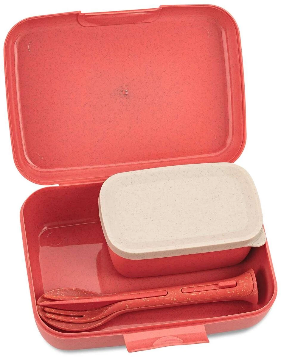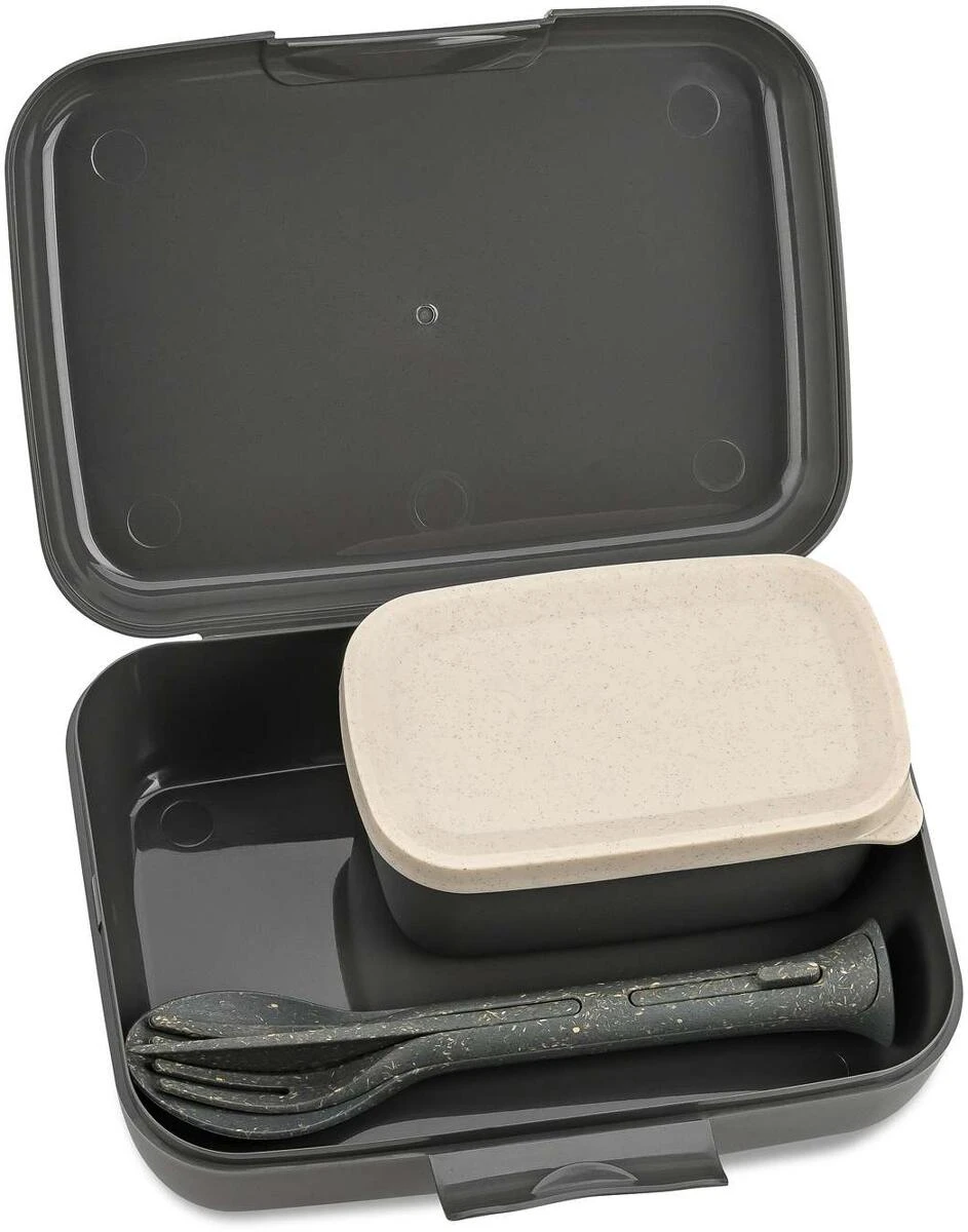 Lunchbox-Set CANDY READY hat alles, was man für ein gesundes Mittagessen unterwegs braucht. In der großen Box CANDY L und der auslaufsicheren Dose CANDY S sind Salate und Dressing, Gemüsesticks und Dip, Sandwiches und Obst sauber voneinander getrennt und das Essen bleibt appetitlich bis zum Verzehr. Besteckset KLIKK POCKET findet in der großen Box ebenfalls Platz und rundet das Lunchbox-Set perfekt ab.