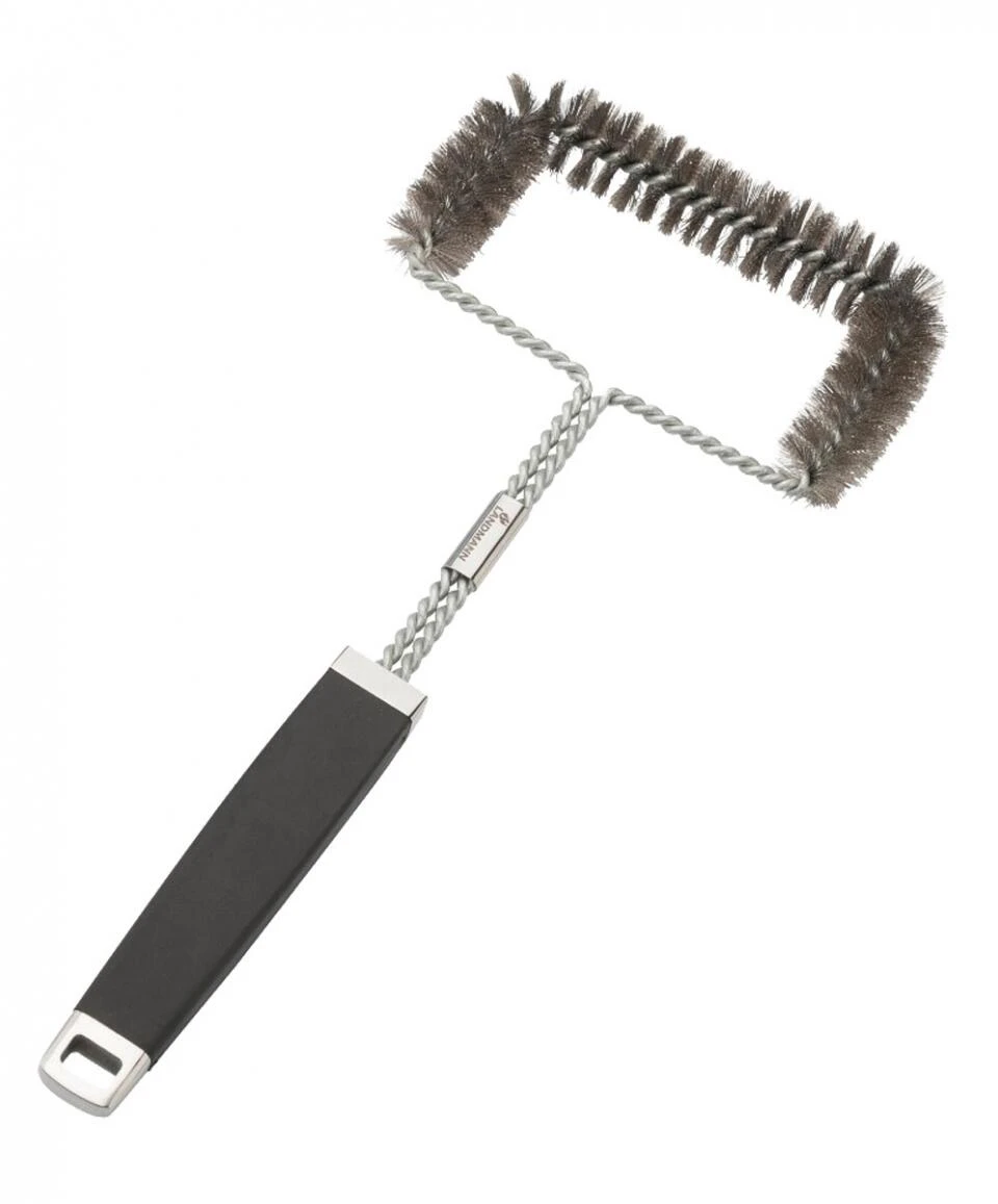 Dreiseitig, mit weichen Edelstahlborsten. Gummierter Griff für eine sichere Handhabung. Ideal auch für Gussroste und -platten.
