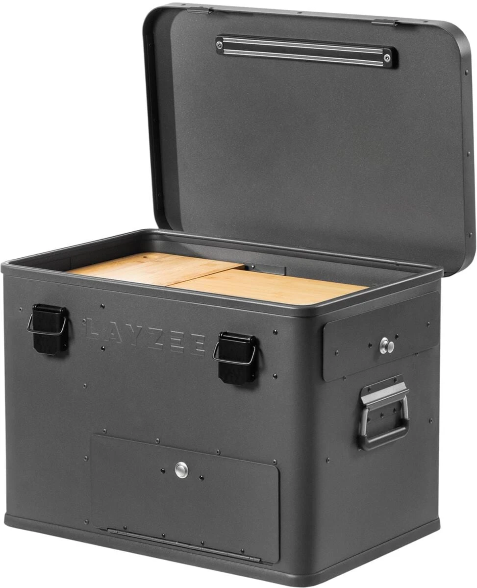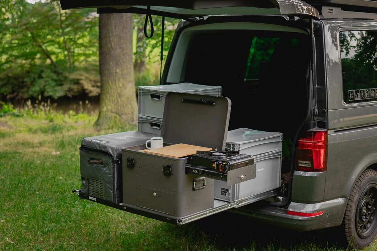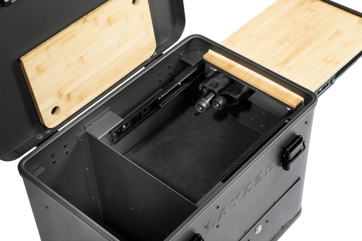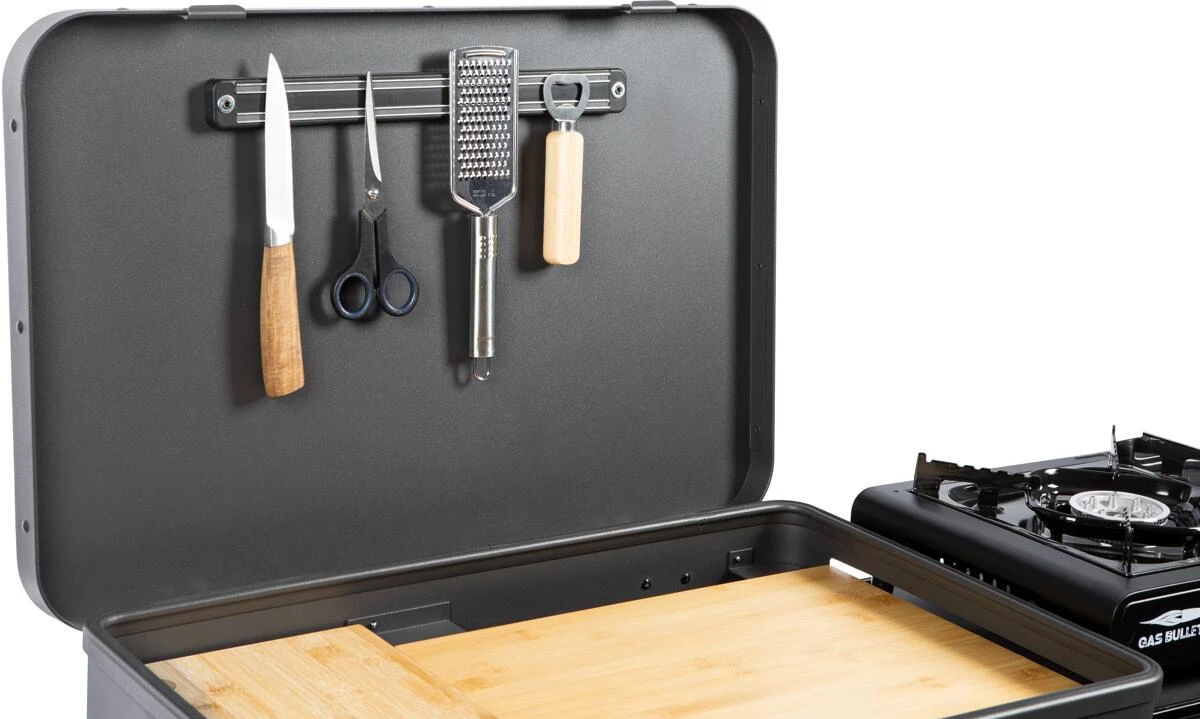 Die Layzee Kitchenbox ist eine mobile Küchenbox für jedes Fahrzeug. An der im Deckel Integrierten Magnetleiste lässt sich das Kochequipment bequem anbringen. Im aufgeklappten zustand kann der Deckel dank der höhenverstellbaren Beine als Tisch genutzt werden. Der Seitliche Auszug eignet sich bestens als Abstellfläche für den optional erhältlichen Gaskocher. Der optional erhältliche Gaskocher findet im Staufach mit Klappe und Druckknopf seinen sicheren Platz. Dank der Mitgelieferten Antirutschmatten bleibt alles an seinem Platz. Durch das Trennfach im Stauraum lässt sich problemlos Ordnung in der Küchenbox halten.