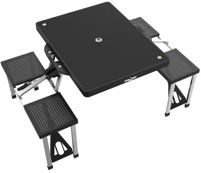 Der Picknickttisch ist blitzschnell aufgebaut und verfügt über 4 fest installierte Sitze, die je bis max. 60 kg belastbar sind. Der Tisch wird in der Mitte zu einem Koffer mit praktischem Tragegriff gefaltet und ist somit einfach zu transportieren. Der Tisch besitzt in der Mitte ein Schirmloch – für Regen oder Sonnenschirm.