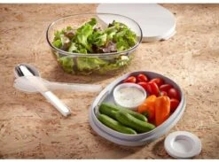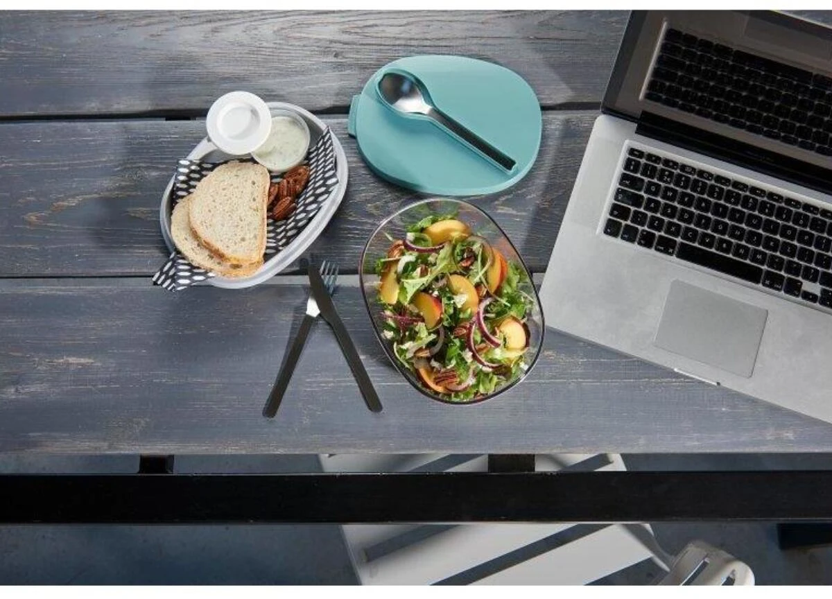 Diese Salatbox Ellipse von Mepal ist groß genug für einen Salat als eigenständige Mahlzeit. Zudem ist die transparente Box mit dunkelblauem Deckel genau richtig für das Mischen und Würzen von Salaten. Brot oder Besteck passen in das obere Fach, Dressings oder Croutons kannst Du in der separaten Mini Box mitnehmen. Die Salatbox Ellipse ist nahez uunzerbrechlich, 100% BPA-frei und spülmaschinenfest.