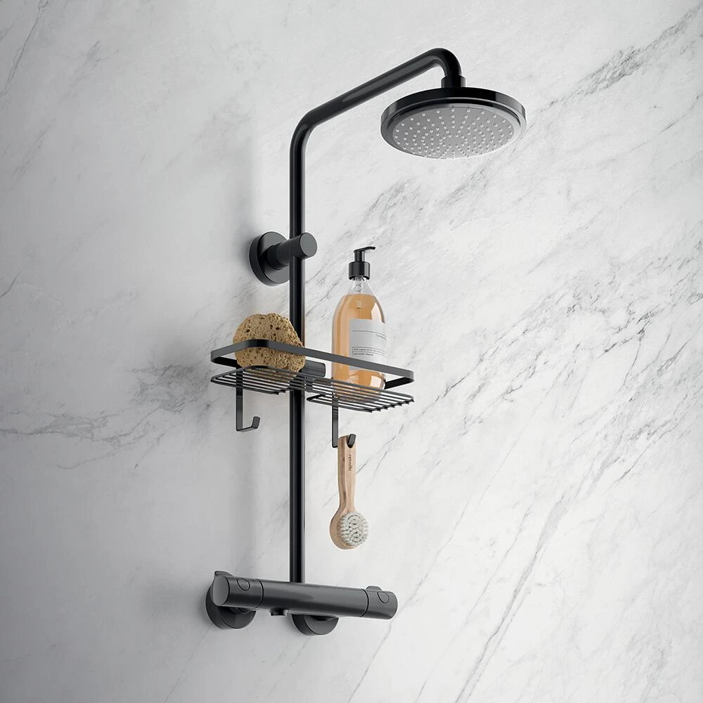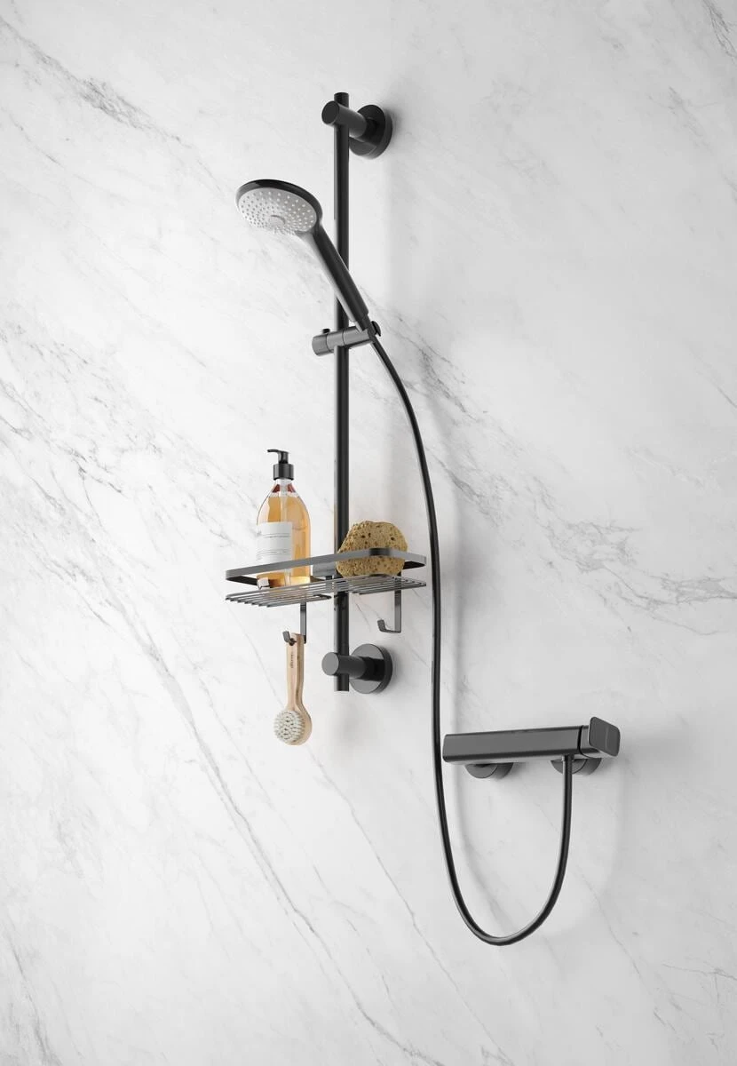 Origin Lava zeichnet sich durch sein funktionales und minimalistisches Design aus, das sich – auch dank seines komplett schwarzen Erscheinungsbildes in Touch-Therm – jeder Umgebung und jedem Badezimmerstil anpasst. Diese Ablage ist zur Montage an der Brausestange. Die Anbringung erfolgt ohne Werkzeug, nur mit dem beiliegenden Montagematerial zu Befestigen. Universell einstellbar auf jede Stärke.
