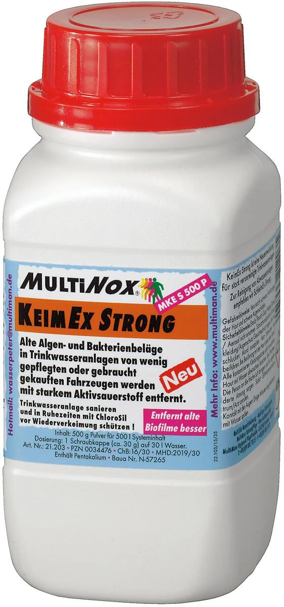 Boiler ausschalten! KeimEx Strong mit Wasser von ca 1/3 des Tankinhaltes unter Rühren mischen (Dosierung 100 g/100l). In den leeren Tank einfüllen. Jeden Wasserhahn einzeln öffnen, damit die konzentrierte KeimEx Strong Lösung in jede Leitung gelangt. Dann Tank ganz mit Wasser auffüllen und KeimEx Strong über Nacht einwirken lassen. Am nächsten Morgen Tankinhalt über jede einzelne Leitung entleeren und gut mit Trinkwasser spülen.