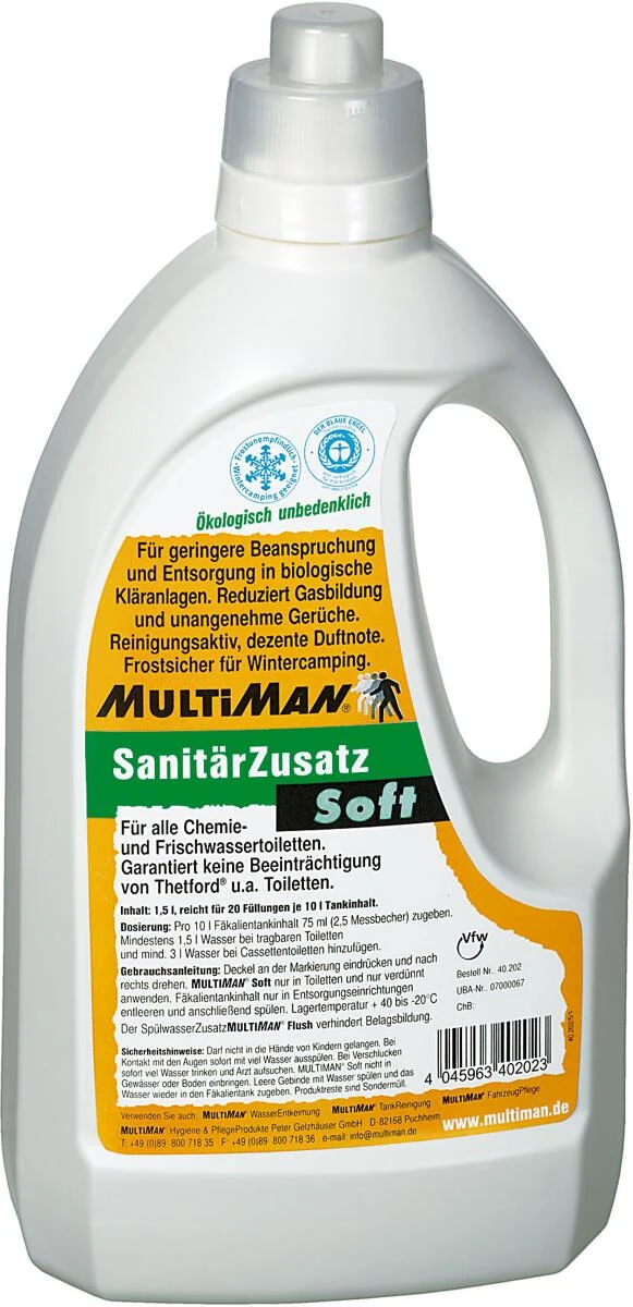 MultiMan® Soft nur in Toiletten und nur verdünnt anwenden. Fäkalientankinhalt nur in Entsorgungseinrichtungen entleeren und anschließend spülen.
