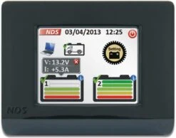 Ausgang für die Starterbatterie: Sobald die Servicebatterien zu 100% geladen sind, lädt es die Starterbatterie mit max. 4 A Ladestrom. So ist auch bei langen Standzeiten die Starterbatterie immer einsatzbereit. Displayanzeige mit Datum und Uhrzeit.
