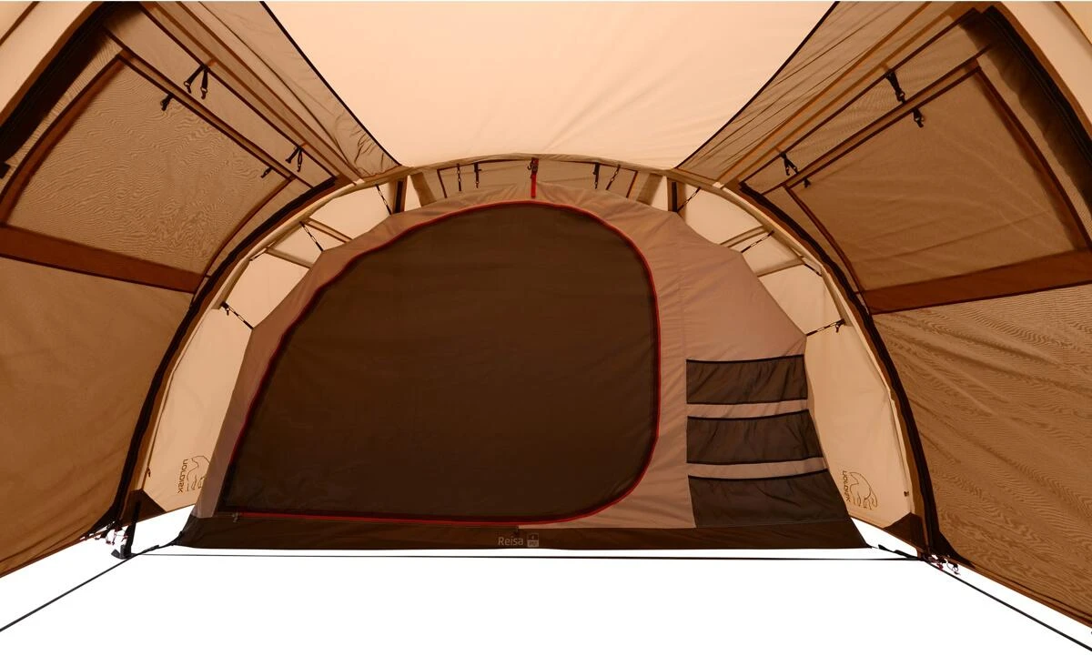 Reisa 4 PU ist ein echtes Familienzelt mit jeder Menge Platz für vier oder mehr Personen in zwei großen Schlafkabinen. Die zweite Kabine ist abtrennbar und der Raum kann stattdessen als Stauraum oder Apsis genutzt werden. Mit seinen farbkodierten Gestängekanälen ist es sehr leicht aufzubauen und sowohl Vorder- als auch Seitentüren können komplett geöffnet und in Kombination mit den vorhandenen zusätzlichen Gestängen als Sonnendach genutzt werden. Beide Türen bestehen aus zwei Schichten mit No-See-Um-Netz und Fenstern mit integrierten Rollvorhängen. Die enthaltene Zeltbodenplane für die Mittelapsis sorgt für einen großen Wohnbereich und die Zeltwand mit jeder Menge Aufbewahrungstaschen im Inneren macht Reise 4 zu einer großartigen Lösung für Familien mit Kindern.