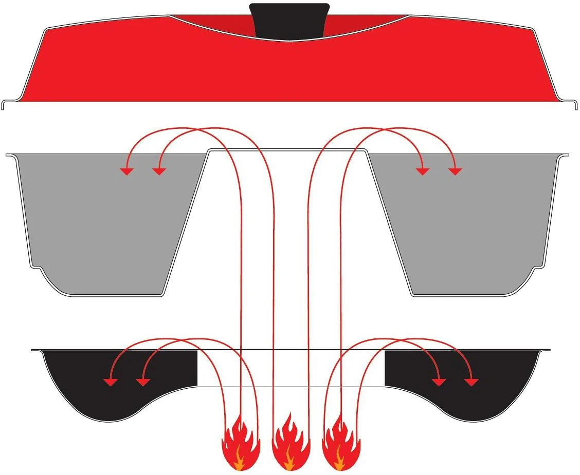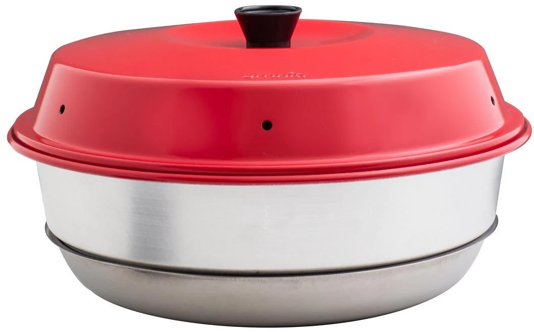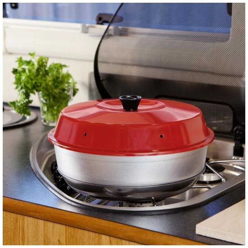 Leicht in der Handhabung funktioniert der OMNIA Campingbackofen auf allen Herden, außer Induktionsherd. Er besteht aus drei Teilen. Die Backform aus Aluminium, die wie eine runde Kuchenform mit einem Loch in der Mitte aussieht, füllt man etwa bis zur Hälfte mit den Zutaten, bzw. mit dem Teig. Zur Form gehört ein speziell geformtes Unterteil aus Edelstahl, das auch ein Loch in der Mitte hat. Der rote Deckel hat kleine Ventilationslöcher und eine ausreichende Höhe, damit Kuchen und Brot ordentlich aufgehen können. Der OMNIA wird mit dem Loch direkt über die Flamme (oder in die Mitte der Herdplatte) platziert. Dadurch steigt die Hitze von der Flamme durch die Konstruktion und erzeugt Ober- und Unterhitze im Backofen. Die Backform sollte vorher immer schön eingefettet sein. Die Garzeiten sind in etwa genauso lang wie bei einem herkömmlichen Backofen.