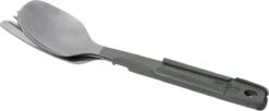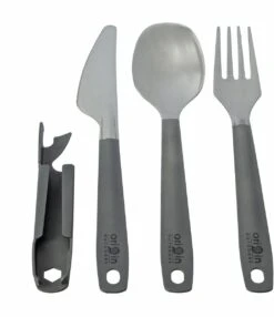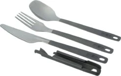 Sehr leichtes und stabiles 4-teiliges Besteckset aus rostfreiem Titan. Das Besteckset lässt sich schnell und einfach kompakt zusammenzustecken und an den Ringöffnungen zum Beispiel mit einem Karabiner am Rucksack befestigen. Messer, Gabel und Löffel sind aufwändig poliert. Zusätzlich befinden sich in der Halterung ein Dosen- und Flaschenöffner sowie ein 6-Kant-Ringschlüssel Größe 7.