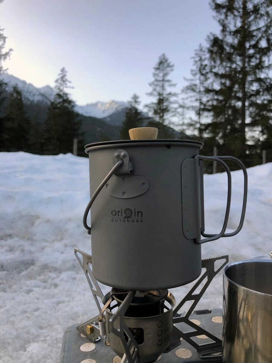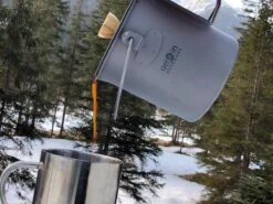 Extra leichte Titan French Press, Topf oder Tasse. Der Kaffeefiltereinsatz aus hochwertigem Edelstahl ist einfach zu reinigen und kann nach Belieben entnommen werden. Ausgestattet mit Ausgießer, Klappgriffen, Inhaltsanzeige in ml und einer Einkerbung im Hängegriff zum Aufhängen über ein Lagerfeuer. Die 3 in 1 French Press ist der perfekte Begleiter zum Reisen, Camping, Wandern und Trekking.