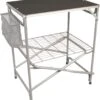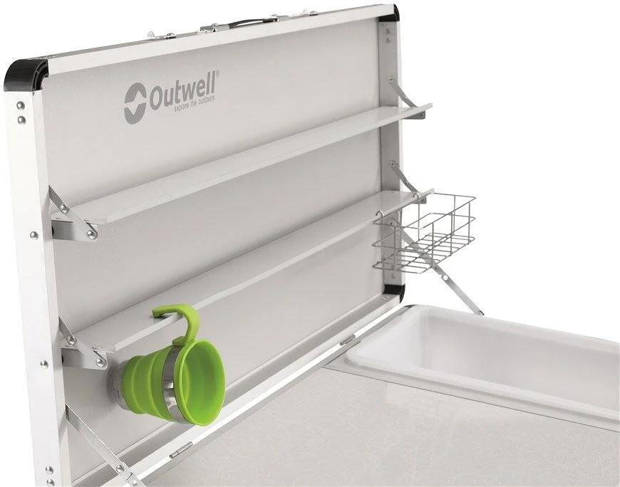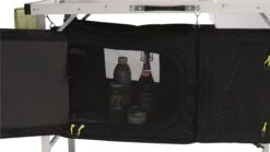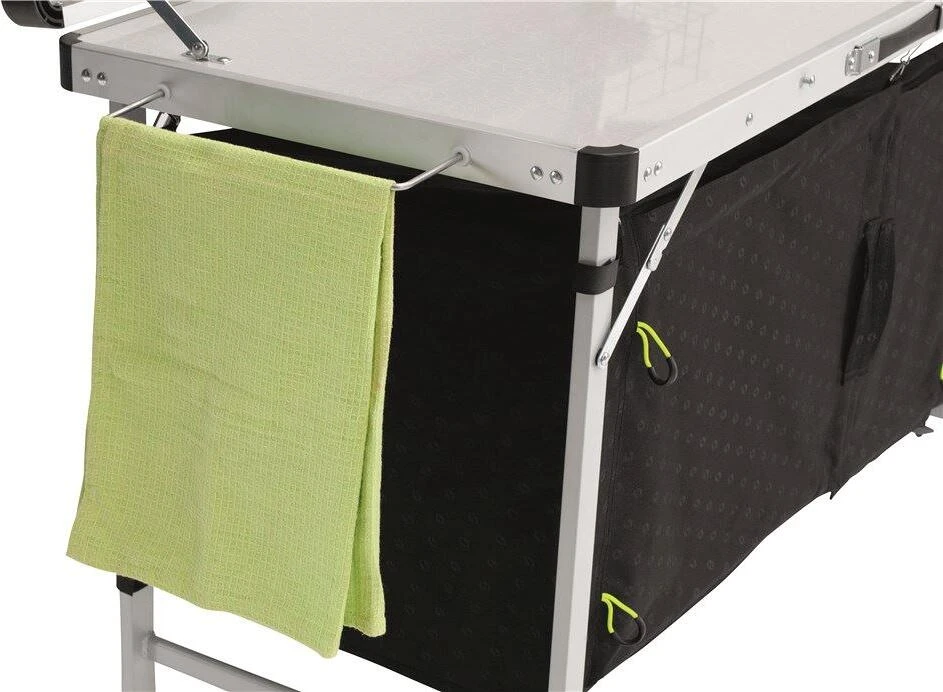 Die Tischplatte, die Ablage und das Gewebe dieses Küchentisches sind mit dem schicken Logo-Muster verziert. Dieser Küchentisch leistet nicht nur als stabile Arbeitsfläche beim Kochen wertvolle Dienste, sondern begeistert auch mit seinem geschlossenen Stauraum zur Unterbringung von Töpfen, Lebensmitteln und Gasflaschen. Mit seiner leichten Handhabung und seinem geringen Packmaß trägt er entscheidend zu einem fantastischen Kocherlebnis bei.
