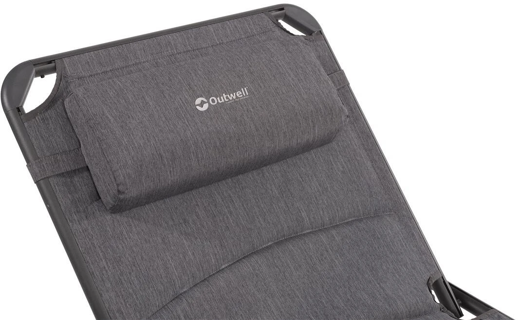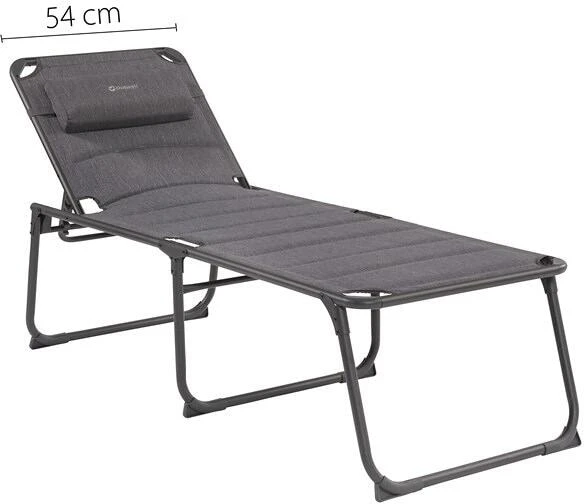 Gepolsterte Sitzfläche und Rückenlehne aus Polyester mit fünf Verstellmöglichkeiten für optimalen Komfort. Besitzt eine maximale Tragkraft von 120 kg dank des leichten, hochfesten, pulverbeschichteten Aluminiumrahmens mit integriertem, abnehmbarem Nackenkissen