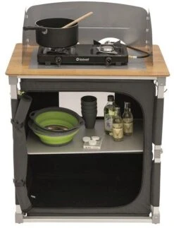 Eine beschichtete Metallplatte schützt die Bambustischplatten vor der von den Gasbrennern erzeugten Hitze.