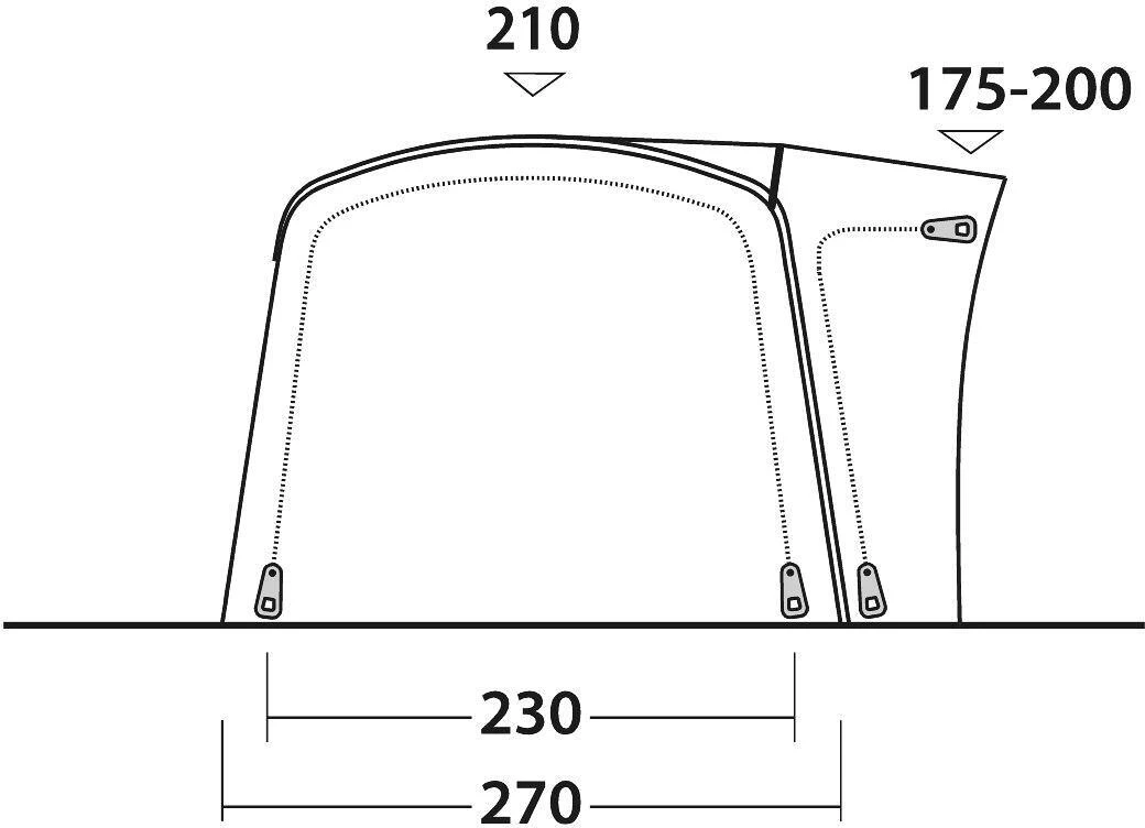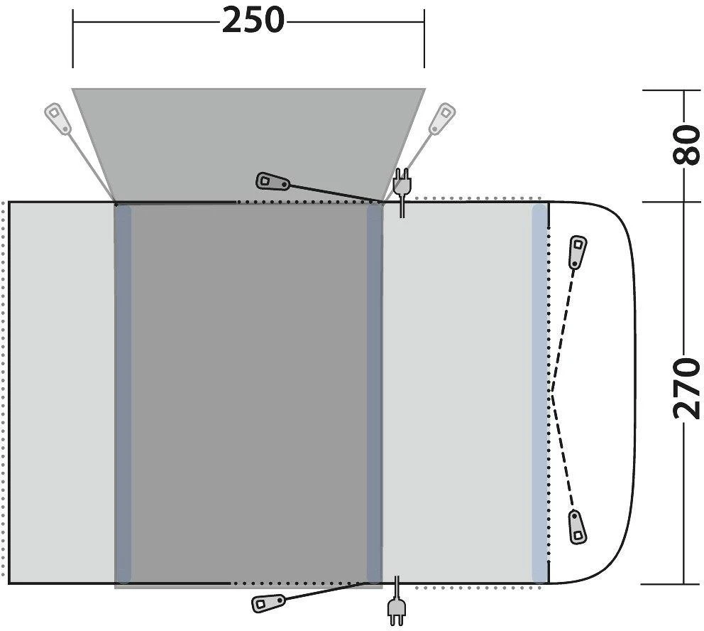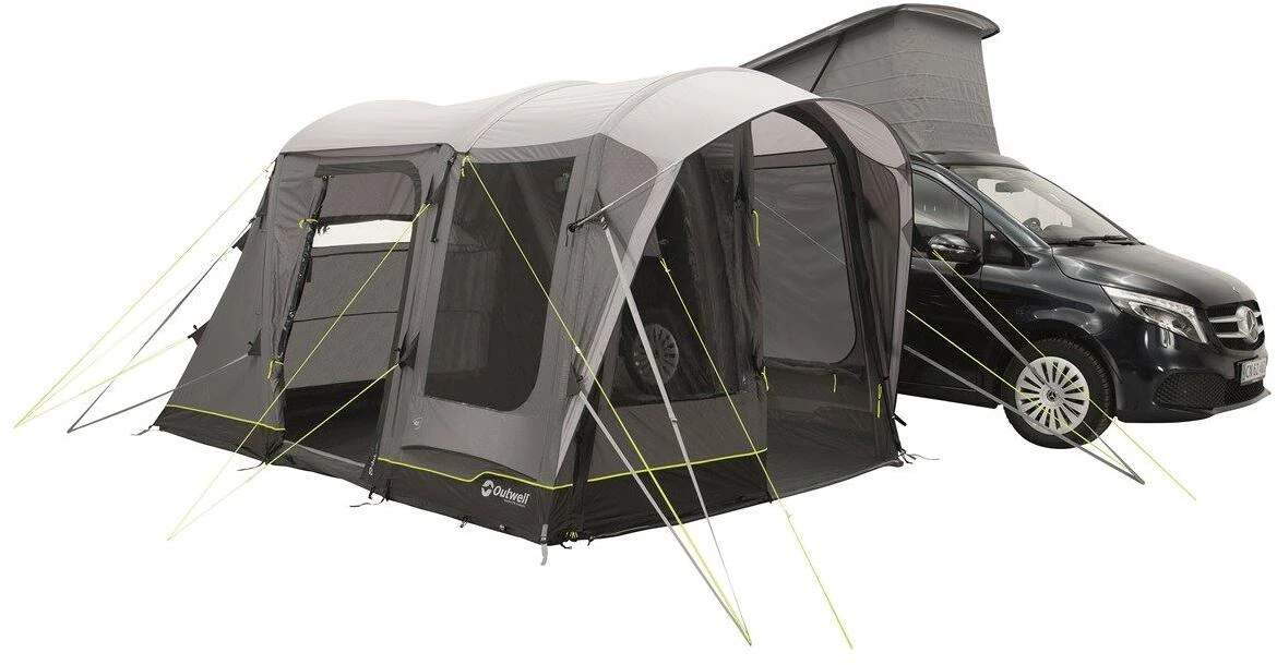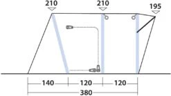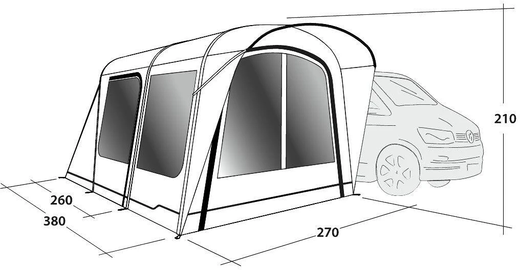 Das Wolfburg 380 Air ist ein freistehendes, aufblasbares Vorzelt, das parallel zum Bus steht. Trotz der schönen Größe benötigt es gemeinsam mit dem Bus nur eine recht geringe Stellfläche. Das lichtdurchflutete Vorzelt mit einer Innenfläche von 270 x 380cm, bietet selbst bei Nutzung der optionalen 2er-Schlafkabine immer noch einen groĂźzĂĽgigen Aufenthaltsraum. Die senkrechte Vorderwand inklusive groĂźer MoskitonetztĂĽr kann komplett geöffnet werden und ist durch ein Vordach geschĂĽtzt. In beiden Seiten sind weitere Ă–ffnungen, die auch eine separate InsektennetztĂĽr haben. In der RĂĽckwand befindet sich ein weiterer groĂźer LĂĽfter, der eine gute QuerbelĂĽftung ermöglicht. Alle Fenster lassen sich von innen verschlieĂźen. Die abnehmbare Schleuse kann an beiden Zeltseiten montiert werden und so kann die Vorderseite entweder Richtung Fahrzeugfront oder aber zum Fahrzeugheck zeigen – ideal fĂĽr Busse mit HeckkĂĽchen. Sturmbänder sorgen zusammen mit den robusten Luftschlauchsystem fĂĽr eine ausgezeichnete Stabilität auch bei widrigen Bedingungen.