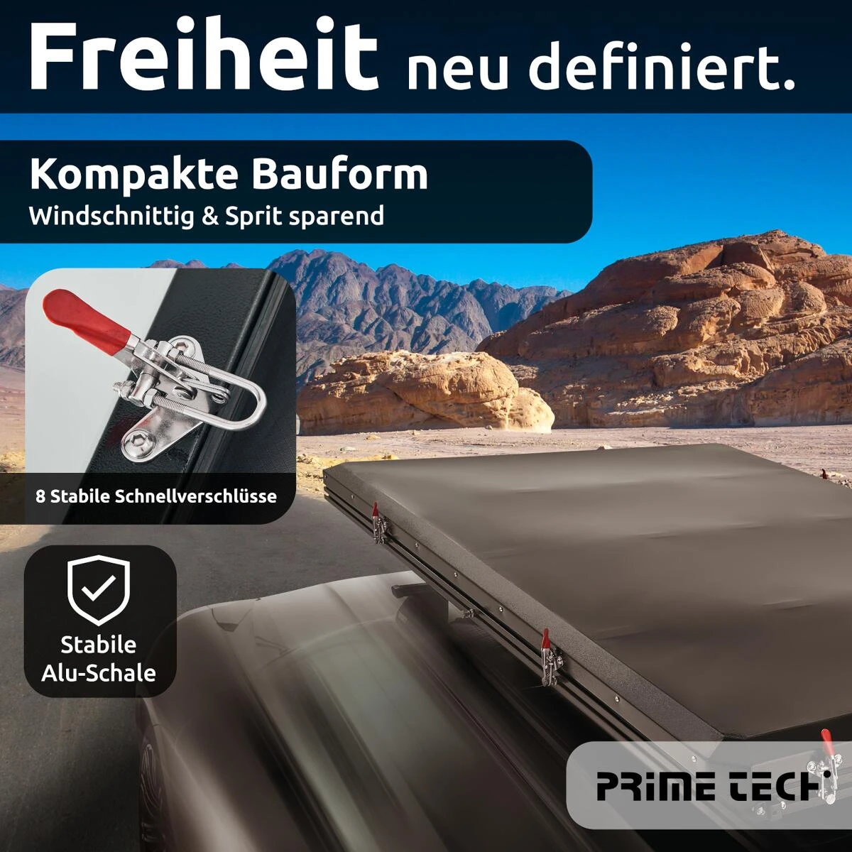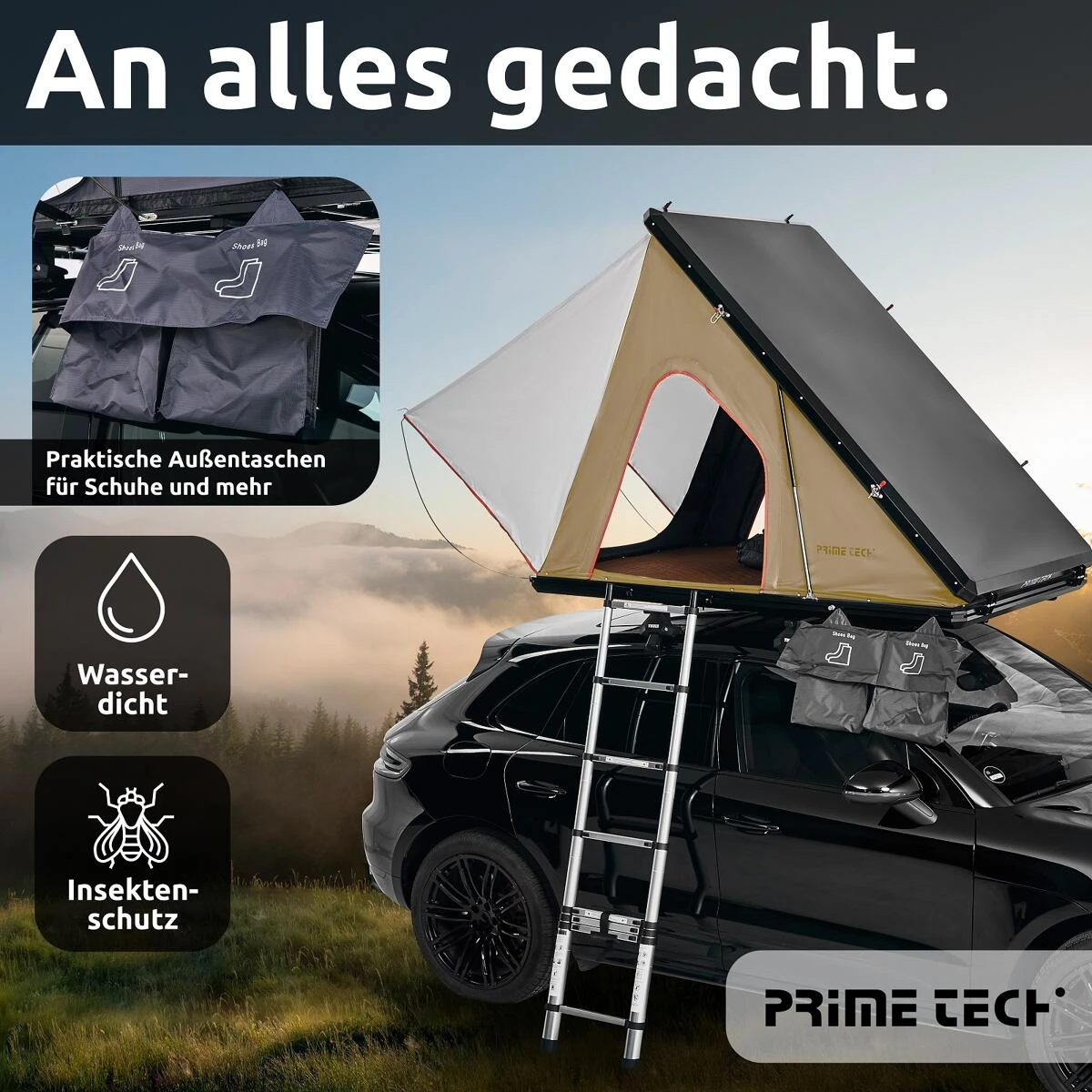 Die Prime Tech Hartschalendachzelte der Serie Gamma vereinen eine kompakte Bauform mit der Robustheit des Voll-Aluminium-Aufbaus und einem geringen Gewicht. Der robuste Eindruck, ohne aufdringlich oder klobig zu wirken, wird durch den Aufbau mit umlaufendem Rahmen und geschlossenem Boden und Oberschale unterstrichen. Sehr stabile Verschlüsse, Scharniere und Leiteraufhängungen runden das Konzept ab. Natürlich sind auch die Befestigungen der Gasdruckfedern ebenso robust gehalten. Innen verfügt das Dachzelt über mehrere Taschen zur Aufnahme persönlicher Ausrüstung, zudem gibt es Schuhtaschen. Alle Fenster bzw. Eingänge sind mit Fliegengase versehen, was eine Lüftung ohne lästige Insekten im Zelt ermöglicht. Die höhenverstellbare Leiter kann wahlweise an einer der beiden Längsseiten als auch am Heck eingehängt werden. Der Zugang ins Zelt ist somit von drei Seiten möglich. Der Eingang am Heck ist zusätzlich mit einem großen Vordach als Sonnen- und Regenschutz versehen.