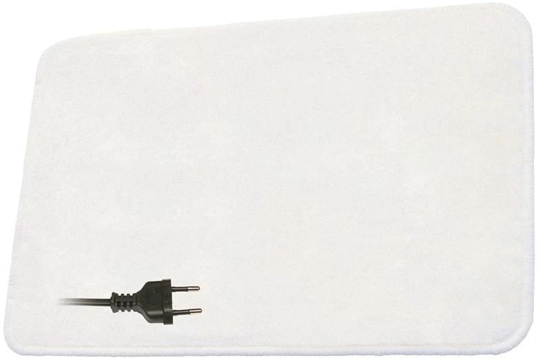 Rückseite. Die Badheizteppiche sind in drei Standardgrößen und mit 12 V- oder 230 V-Anschluss erhältlich. Das Heizgewebe kann mittels Reißverschluss entnommen werden, wodurch der Teppich sich bis zu 60 °C in der Waschmaschine reinigen lässt.